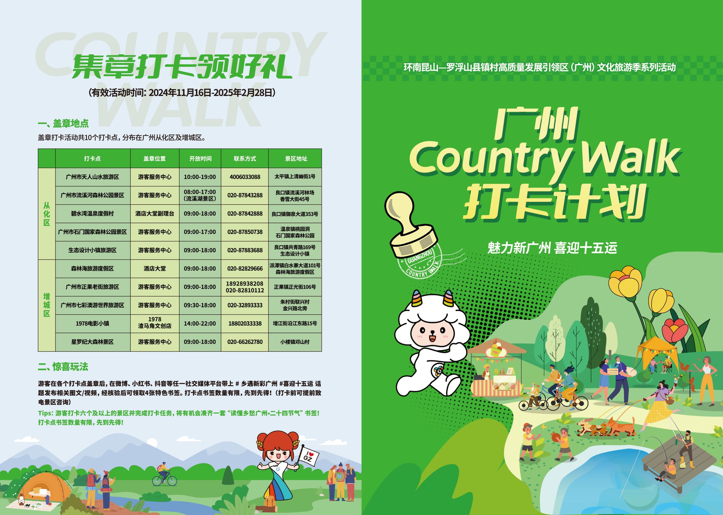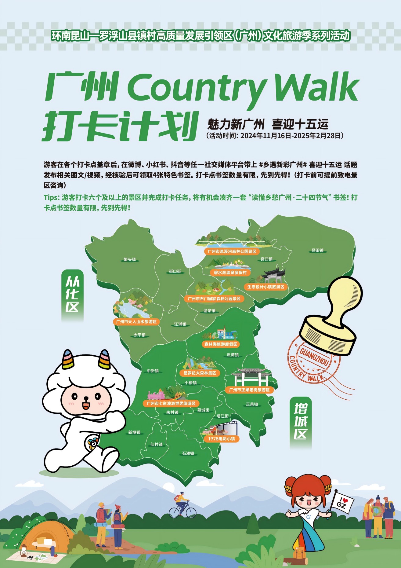 “广州Country Walk打卡计划”有效活动时间为2024年11月16日-2025年2月28日,游客可前往10个指定打卡点领取打卡折页并盖章(每人限领一张折页,先到先得)。